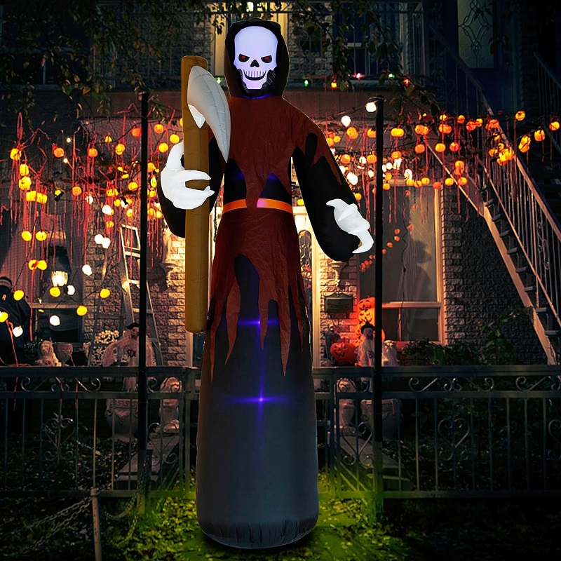 11.5 Foot Long Inflatable Grim Reaper Driving Pumpkin CarriageCheck PriceHOMCOM 7.5′ W Halloween Inflatables Outdoor Decorations Grim Ghost Biker, Blow Up LED Yard Decor for Garden, Lawn, Party, Holiday, WaterproofCheck Price8 Foot Long Lighted Halloween Inflatable Grim Reaper Ride Train with Tombstone Cat Bat Pumpkin Indoor Outdoor Yard Art DecorationCheck Price
